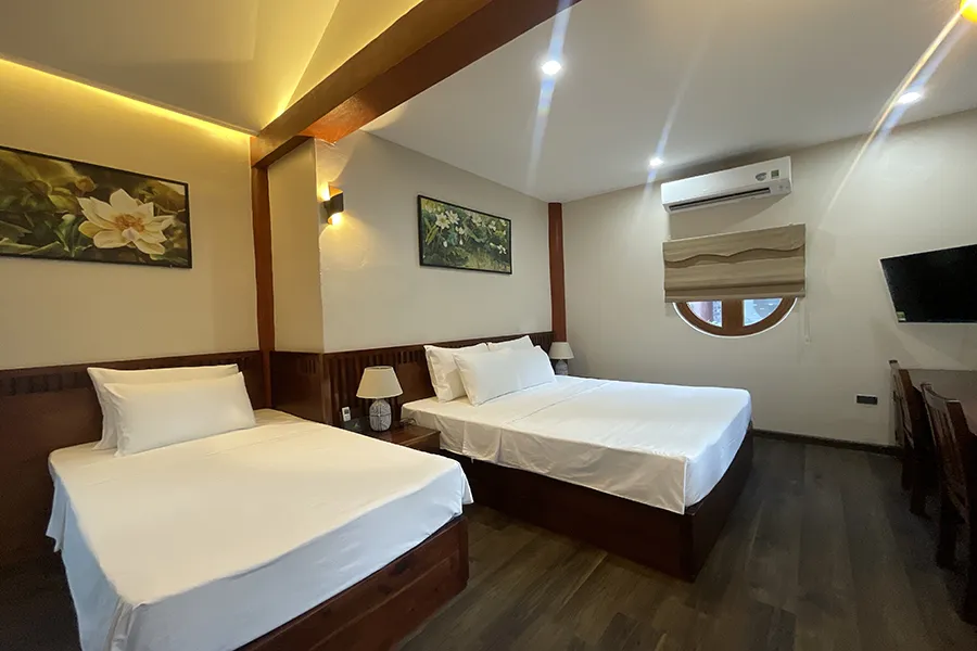 Hạng phòng Deluxe Triple với tổng 07 phòng với diện tích 45m2 mỗi phòng. Các phòng đều được trang bị 01 giường double (1m8x2m) và 01 giường single (1m1x2m), đều có ban công rộng view vườn và view hồ. Phòng ở tối đa 03 người lớn & 01 trẻ em dưới 06 tuổi