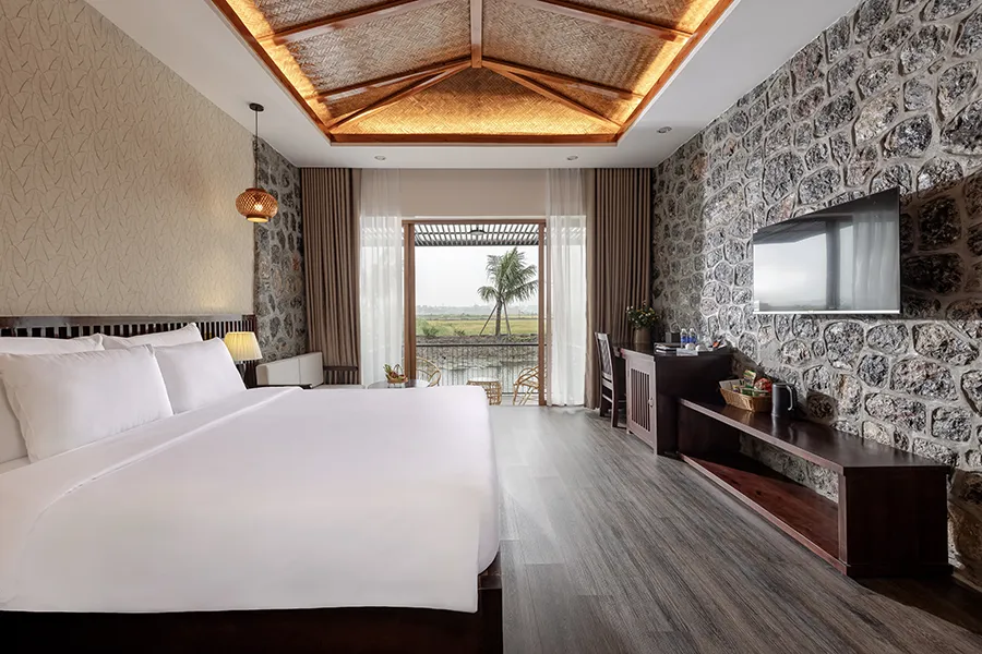 Thuộc khối villa song lập 1 tầng, bao gồm 10 phòng với diện tích 40m2 mỗi phòng. Các phòng đều được trang bị 01 giường size King (1m8x2m) và đều có ban công rộng view hồ và cánh đồng. Phòng ở tối đa 02 người lớn & 01 trẻ em dưới 06 tuổi.