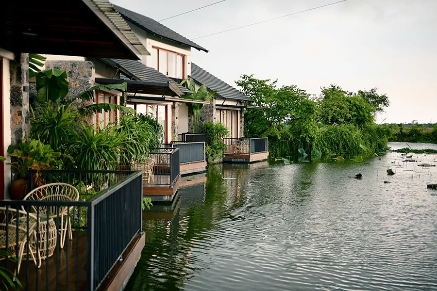 Thuộc khối villa song lập 1 tầng, bao gồm 10 phòng với diện tích 40m2 mỗi phòng. Các phòng đều được trang bị 01 giường size King (1m8x2m) và đều có ban công rộng view hồ và cánh đồng. Phòng ở tối đa 02 người lớn & 01 trẻ em dưới 06 tuổi.