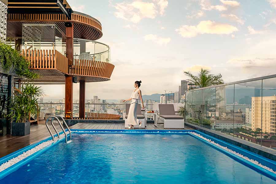 Bể bơi ngoài trời: Tọa lạc trên tầng cao của khách sạn, bể bơi ngoài trời không chỉ là nơi lý tưởng để thư giãn mà còn mang lại tầm nhìn tuyệt đẹp ra biển Mỹ Khê. Du khách có thể vừa bơi lội, vừa thưởng thức những ly cocktail mát lạnh từ quầy bar bể bơi.