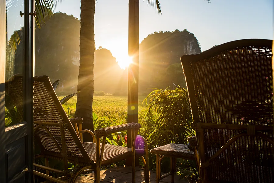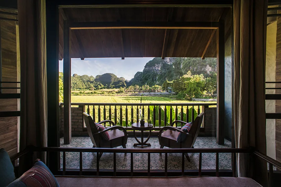 Phòng Mountain Veranda Chamber tự hào sở hữu tầm nhìn ngoạn mục ra những cánh đồng lúa vàng ươm và những đỉnh núi đá vôi đặc trưng của Ninh Bình. Từ vị trí cao trên khuôn viên Tam Cốc, phòng mang đến một góc nhìn mới mẻ, nơi bạn có thể tận hưởng những sắc …